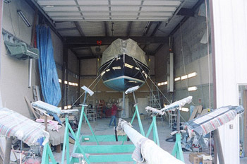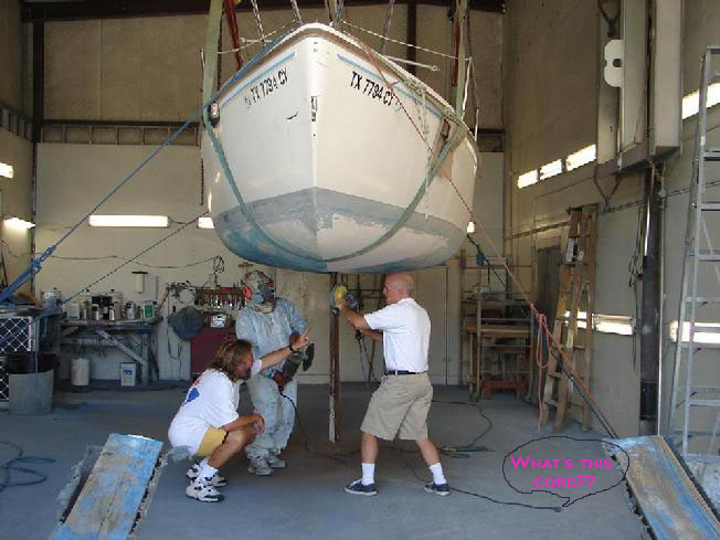 New J-105 hanging in hoist for Bottom Paint summer 2005. Is that keel really crooked?
