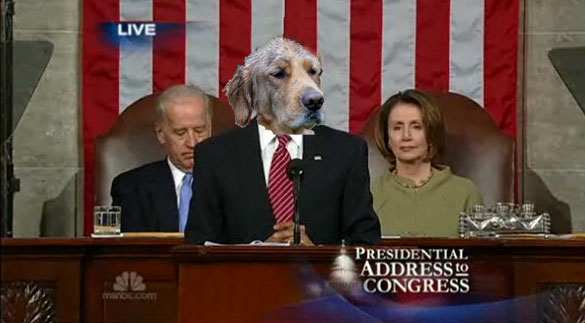 On January 27, 2010. Waldo continues his political career by delivering the yet another Canine reply. He was so confident he didn't even take a bath first. He came straight from rolling on the muddy White House lawn with the First Family's Portuguese Water Dog, slapped on this suit and began speaking>> "My fellow Pooches. Tonight the State of the Union is muddy and wet. We can do better and we must. " I believe there must be immediate legislation passed to provide each home with the funding to keep a jar of biscuits not just by the back door but by every door in every house in America. My plan for regular vet care for every dog was not met well politically. I suppose bringing up cats was not exactly a good idea, I was chewed up in the polls. However we must try to work even with the cats. There is no need to continuously campaign for our respective sides by tattling about claw marks and chewed furniture. To use their terms 'We must claw our way through this.".... He continued for many minutes. .