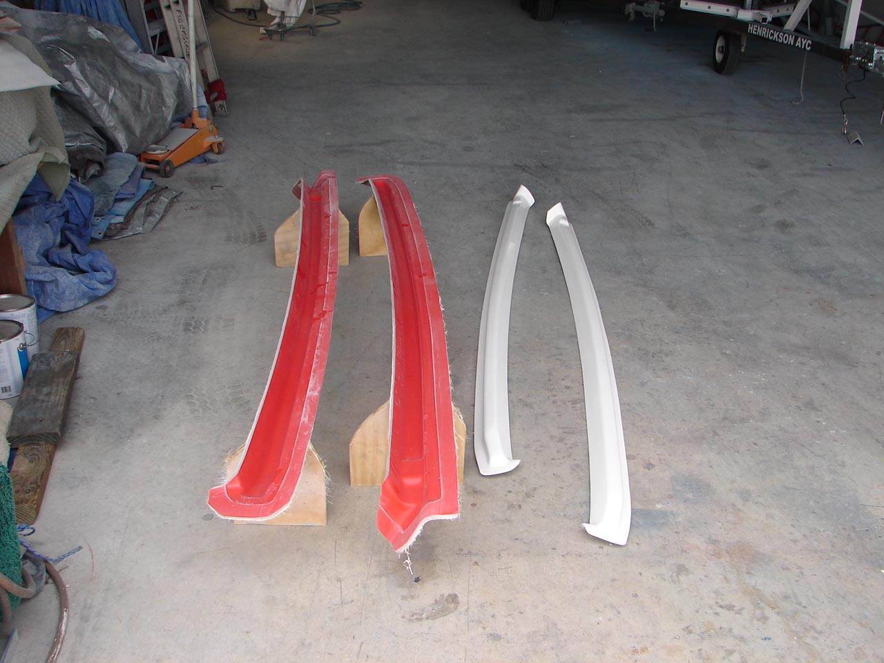 Fred's Proposal I am not an authorized J-22 sailboat builder. For the last 30 odd years I have made a substantial part of my living by maintaining various "J" racing boats. I have no real reason to change that relationship described as "You build them and I fix them." I also understand that other suppliers have built many retrofit J-22 racing items and few if any have bothered to do as I am doing and seek approval before producing and selling parts for racers. I have dabbled in the creation of J boat retrofit parts and even sold many racing motor mounts for installation at the factory on J-24s. Link to photos My initial target guess price for this kit would be $600. I would happily build and sell the parts and maintain one design quality control as described below and for the short term, I will even try my guess price as the officially set price. No other part builder original or aftermarket is building to an approved set price . ( $650 with preinstalled Harken 150 cam cleats.) I would initially build and ship One design Standard parts to any builder for a set $400 plus packing and shipping price. I will build a set of tooling for any Designer and Builder Authorized manufacturer to use. That tooling would be just as the molds in the photos below. Mine have orange tooling gelcoat, at least 6 oz of mat and Iso resin, a layer of 2 mil Coremat, one layer of 1.5 oz mat, another layer of Coremat and at least 6 oz of mat. I tried to keep the Coremat away from the edges of the molds. I believe I could build a set of molds for $1000. That number may cover only the labor and not materials and shipping or perhaps I could accomplish the entire task for under $1000. Particulars could be worked out if and when anybody seriously asks for a set of molds but I am willing to guarantee delivery in the US for under $1500.