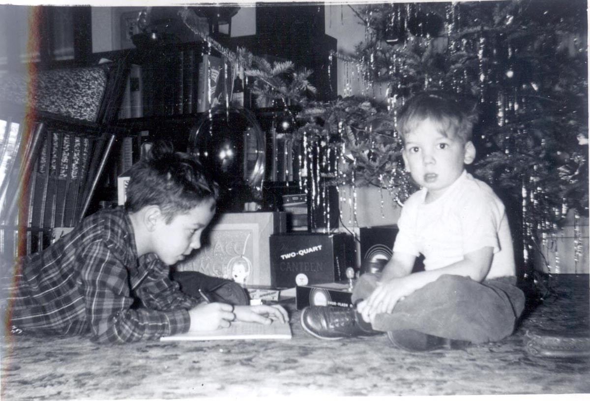 Christmas 1955 with Brother Pete. Our last one in Kenmore and Pete the Cub Scout got a new canteen.